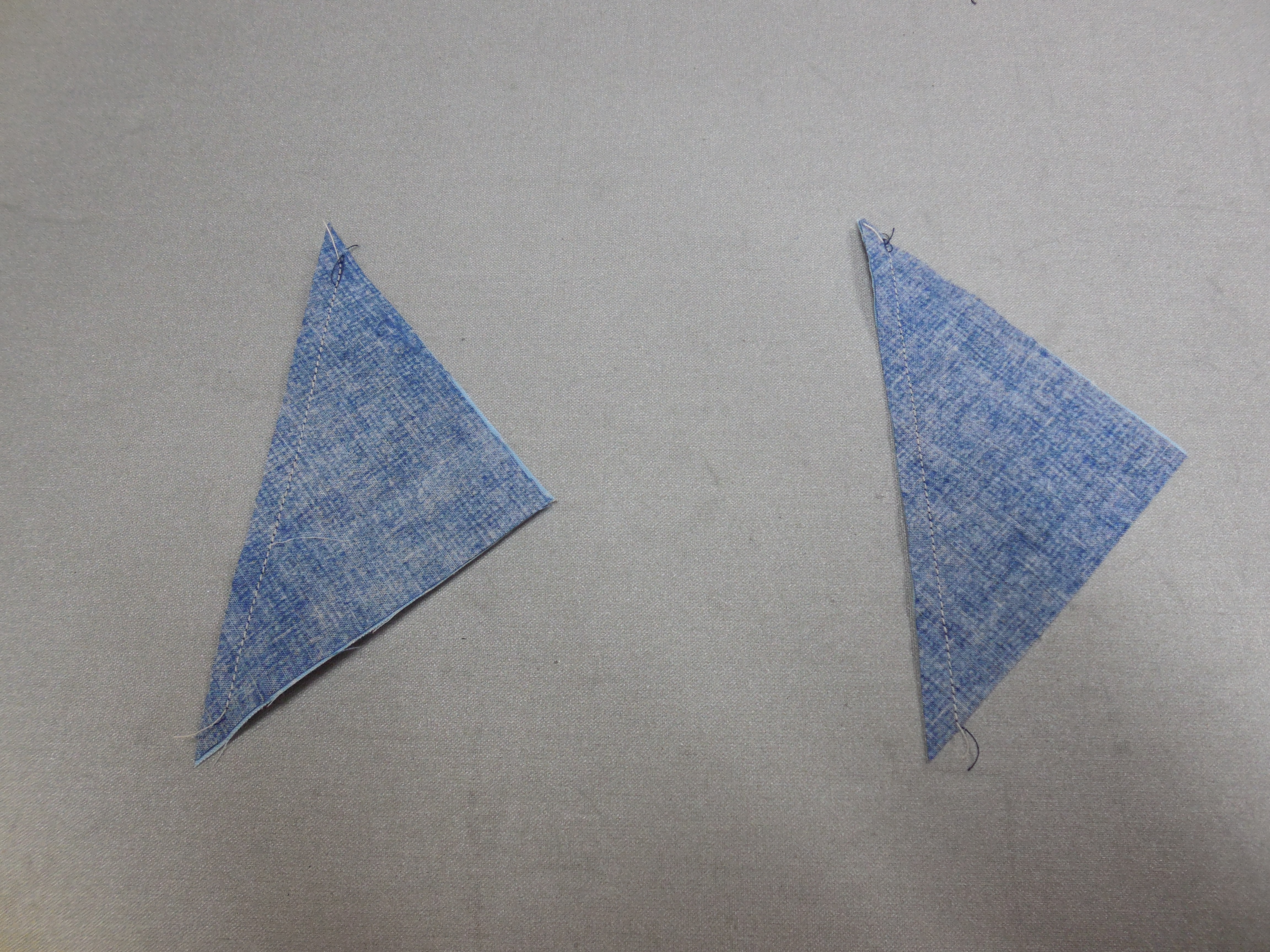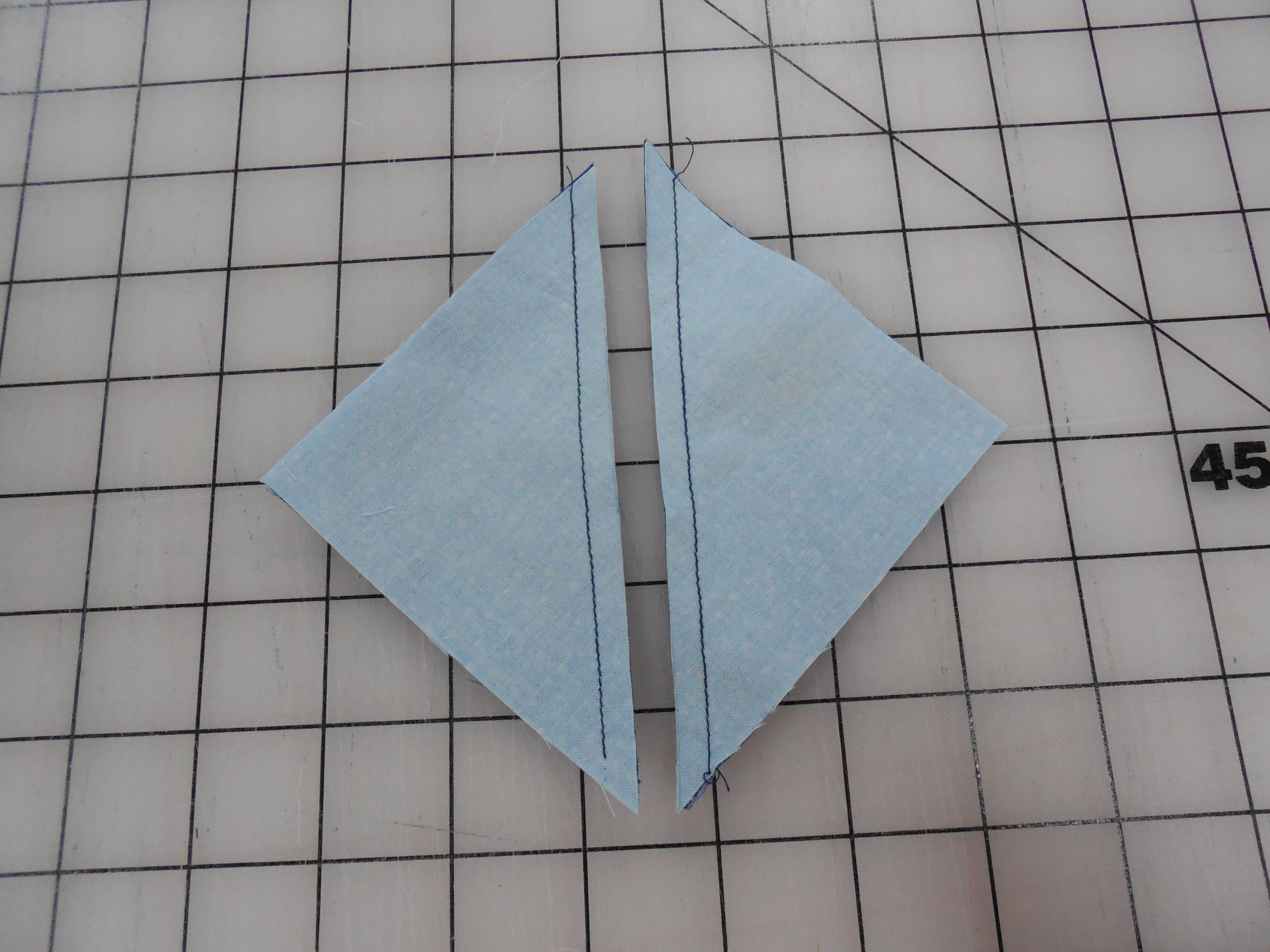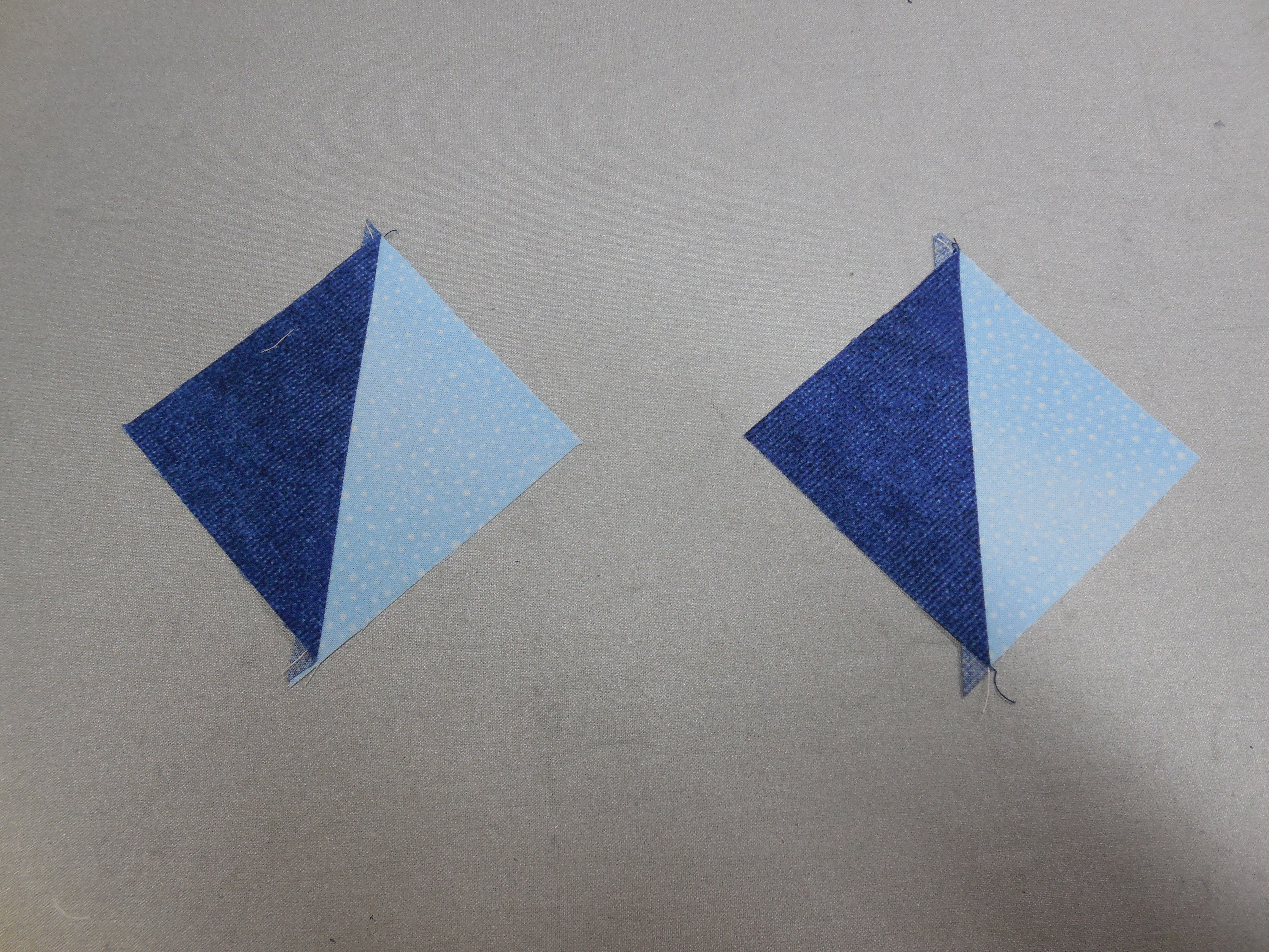 Open the triangle units and press toward the darker fabric.  Trim each unit to 3″.