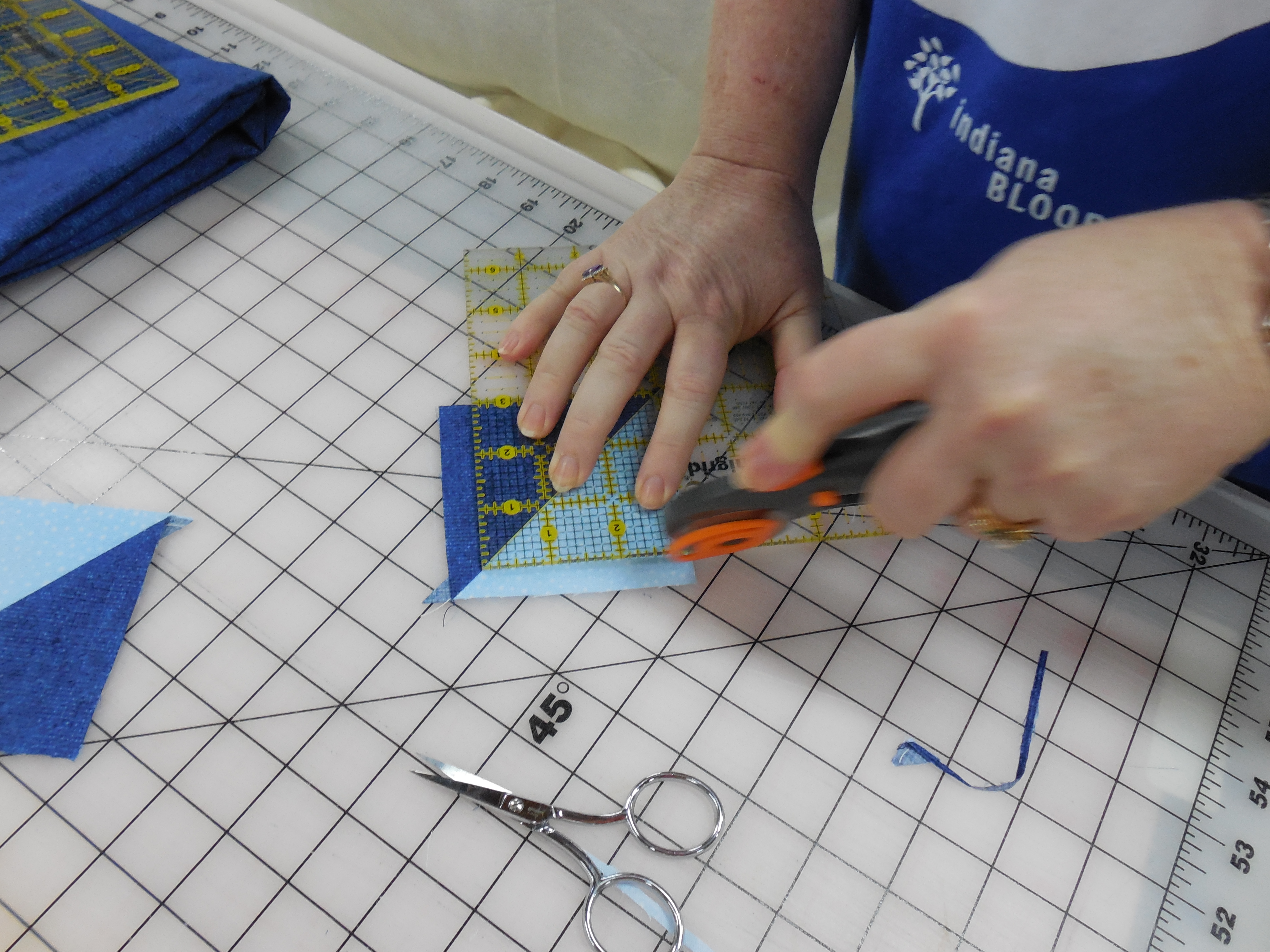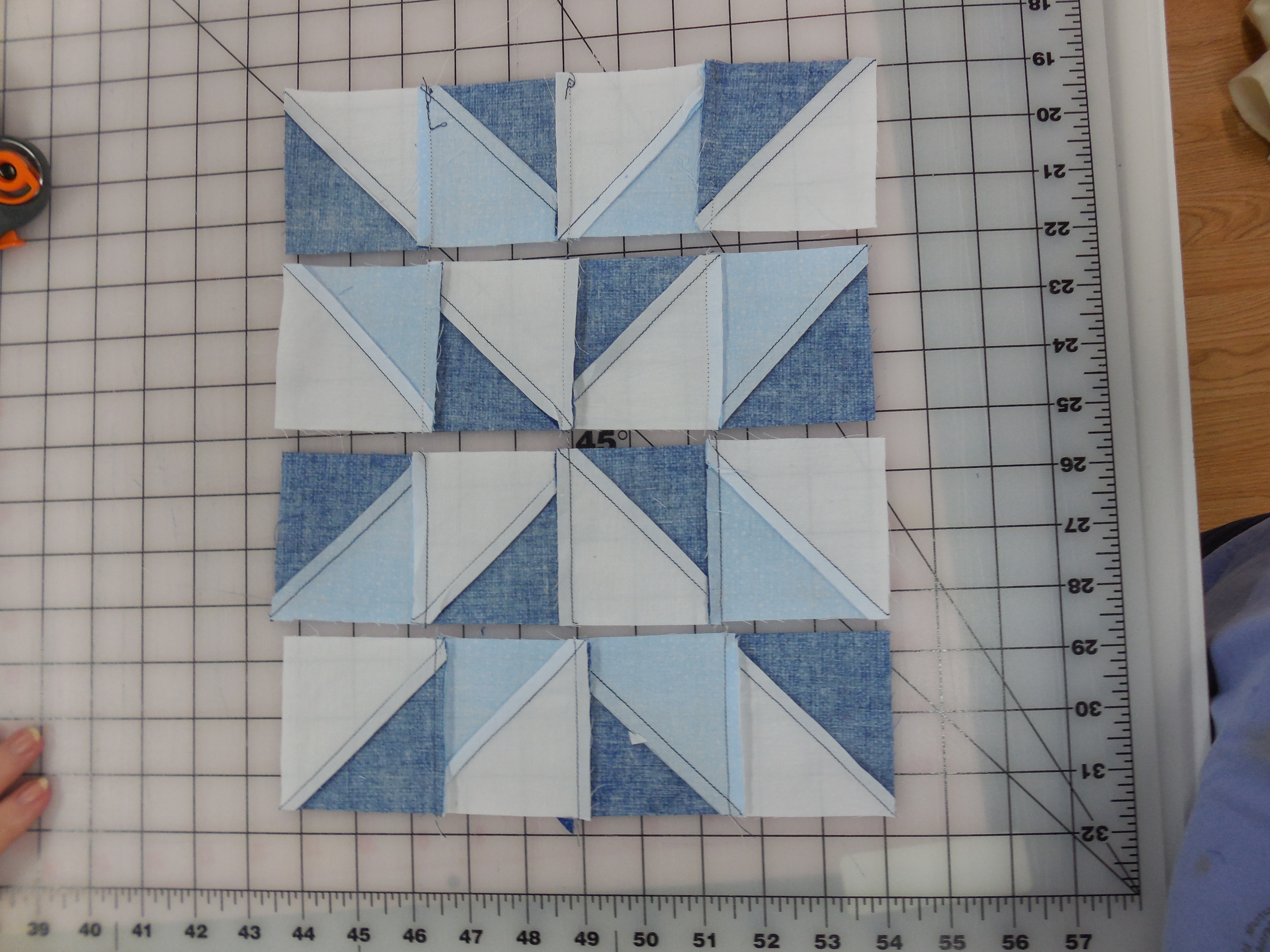 So…..we begin by cutting 4″ squares.  You will need 6 dark blue, 4 light ice blue and 6 white.